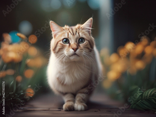 Cat portrait. Ginger tabby cat. Cat on a blurred natural background with bokeh highlights. AI generated
