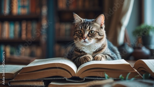 cat scientist sitting on a book in library