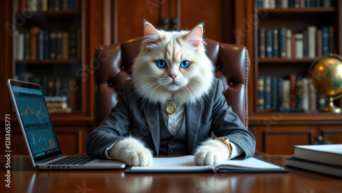 Cat sitting at a desk like a businessman with laptop, books, and a globe, creating a humorous scenario of animal work life.