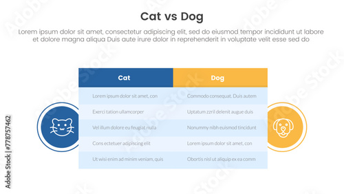 cat vs dog comparison concept for infographic template banner with big table box and circle shape badge with two point list information