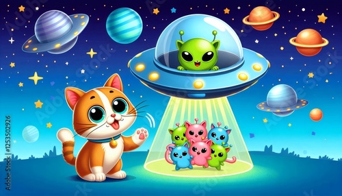 cat welcome alien ufo flying saucer forest night stars planets space another planet fantasy