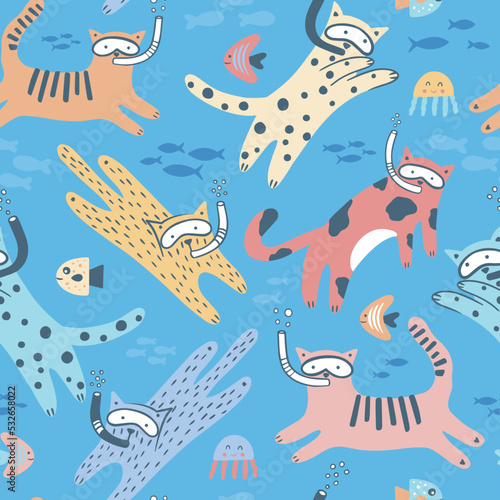 Cats underwater. Childish seamless pattern with pets and fish on a blue background. Can be used for wallpaper, textile, print.