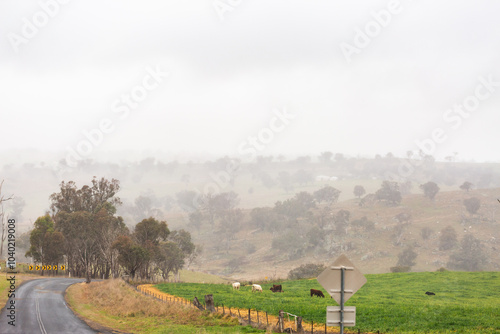 cattle in green paddock on misty rainy day with fog obscuring hills