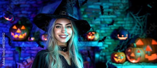 Caucasian beautiful woman smiling dressed as a witch, inside a Halloween-themed room with Jack-o'-lanterns, cobwebs, bats, copy space