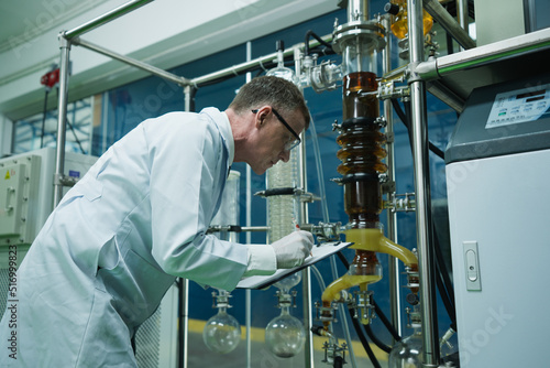Caucasian biochemical scientist with lab coat, gloves and glasses is holding paperwork and recording the pressure and temperature of cannabis extraction. Marijuana researcher looking at this machine.