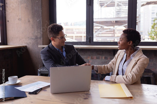 Caucasian businessman and african american businesswoman shaking hands while sitting at a cafe
