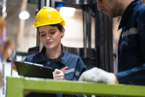 Caucasian businesswoman with buddy workers using clipboard checking Kraft paper stock while standing on scissor lift in warehouse