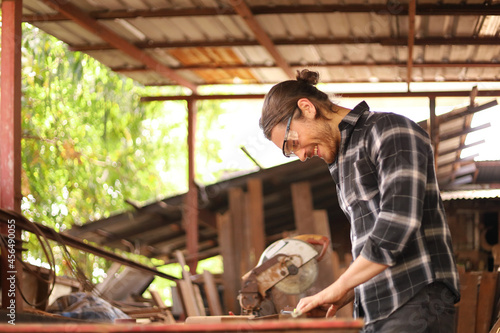 Caucasian carpenter man is using solid square measuring to scale the plank of wood in his own garage style workshop for hobby