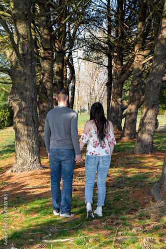 Caucasian couple being affectonate among tall pine trees outdoors.