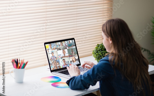 Caucasian girl using laptop for video call, with smiling diverse elementary school pupils on screen