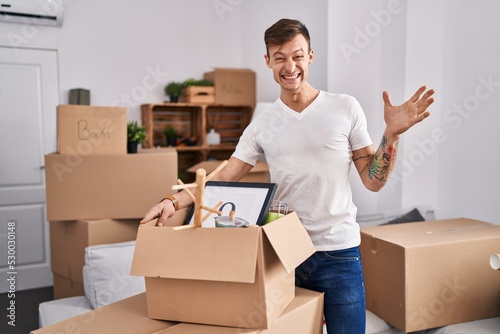 Caucasian man holding screwdriver at new home celebrating victory with happy smile and winner expression with raised hands
