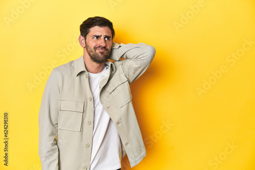 Caucasian man in grey shirt, studio shot on yellow touching back of head, thinking and making a choice.