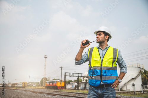 Caucasian man railway engineer use walkie-talkie talking in the site work of train garage.
