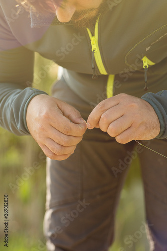 Caucasian man snaps tackle fishing. Hands close up