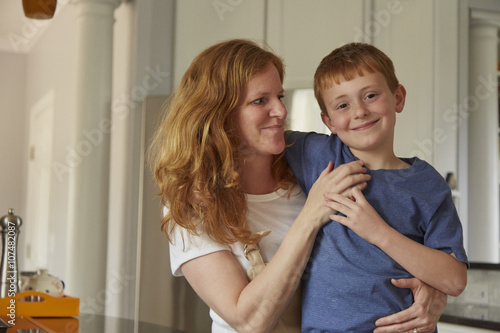 Caucasian mother and son smiling in kitchen