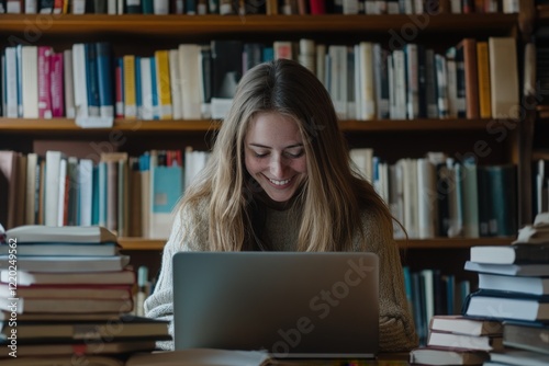 Caucasian student happy smiling girl woman studying with laptop and books homework learning online knowledge prepare for test exam study at library cram SAT test bookworm research history prep course