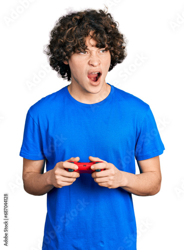 Caucasian teenager playing video game holding controller angry and mad screaming frustrated and furious, shouting with anger. rage and aggressive concept.