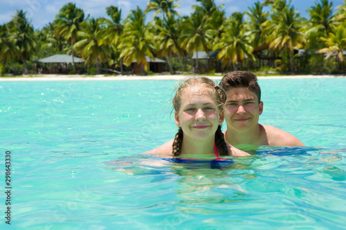 Caucasian teenagers swimming in Caribbean sea, Dominican Republic. Summer vacation concept