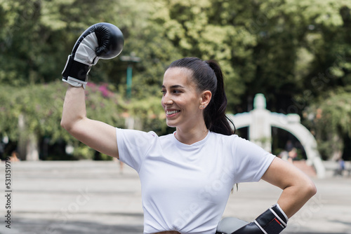 Caucasian woman smiling and posing wearing boxing gloves in a park in Mexico City.