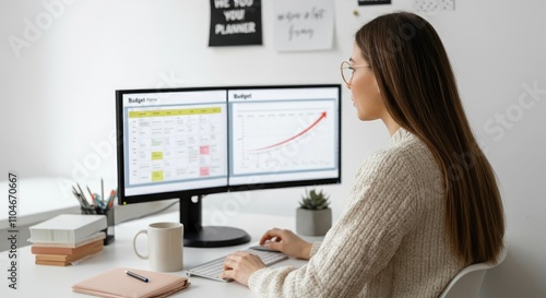 Caucasian woman working at desk with dual monitors analyzing financial data in home office setting