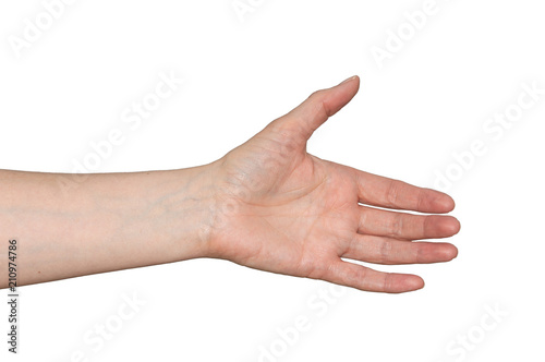 Caucasian woman's hand in helpful gesture. Empty open hand showing palm. Isolated on white.