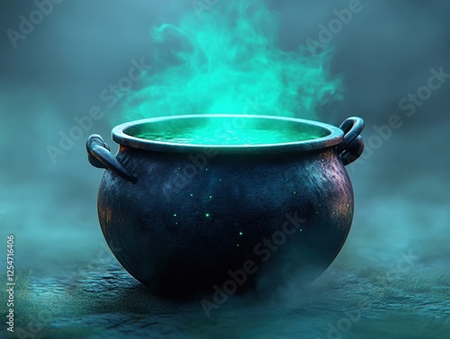 Cauldron bubbling with green potion in a misty atmosphere with soft glowing light effect