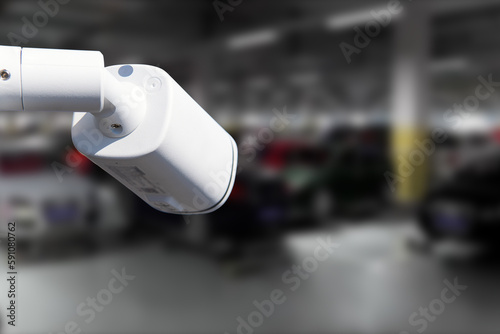 CCTV Camera Operating in car park building. Copy space.