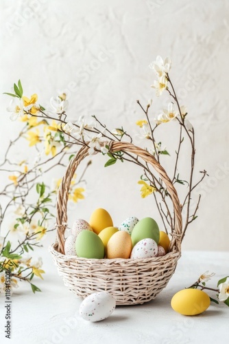 Celebrate Easter with a beautiful basket of colored eggs surrounded by willow branches and flowers on a white table