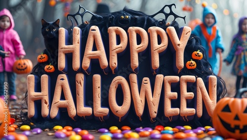 Celebrating Halloween with festive decorations and joyful children in colorful costumes surrounded by pumpkins and spooky elements