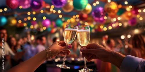 Celebrating the New Year: A toast to the future with champagne flutes held high amidst a vibrant party atmosphere, balloons, and fairy lights. A perfect image for New Year's Eve celebrations.