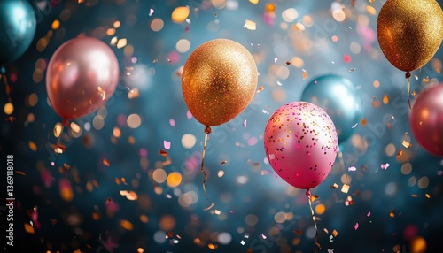 Celebration decorations featuring colorful balloons, confetti, and festive lights create a vibrant atmosphere for a joyful gathering