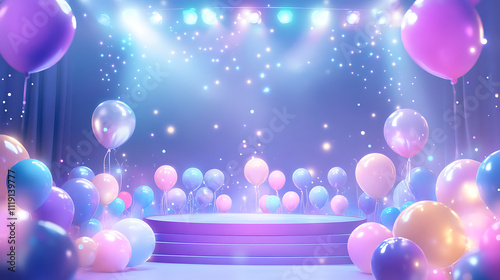Celebration event with colorful balloons on a stage festive atmosphere vibrant lighting for kids' party