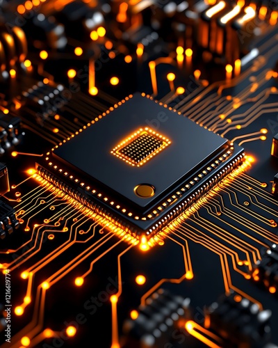 celebration of science and technology day, Detailed Close-Up Illustration of a Microchip Surrounded by Electric Circuits on a Dark Background