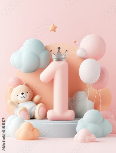 Celebration setup featuring a large pink number one with balloons and a teddy bear