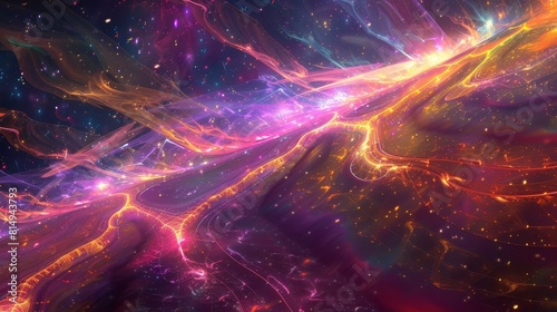 Celestial ballet pulsating ribbons of neon light dancing across star-studded sky backdrop