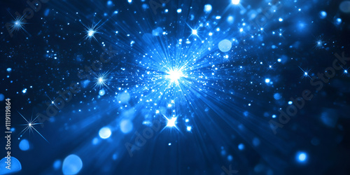 Celestial Blue Burst: An abstract image of a vibrant blue light burst, radiating energy and sparkling with countless lights. Perfect for backgrounds, presentations.
