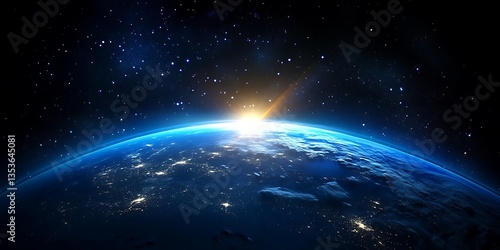 Celestial Dawn: Witness the breathtaking moment as the sun rises over our vibrant planet, Earth, a symbol of new beginnings and global unity. Captured from the vast expanse of space.