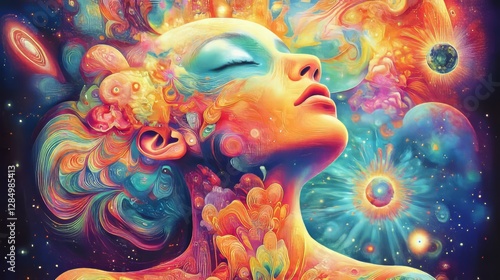 Celestial Dreams: A vibrant portrait of a woman's face and ethereal aura merges with cosmic elements, evoking a sense of inner peace, spiritual awakening, and the boundless nature of the universe.