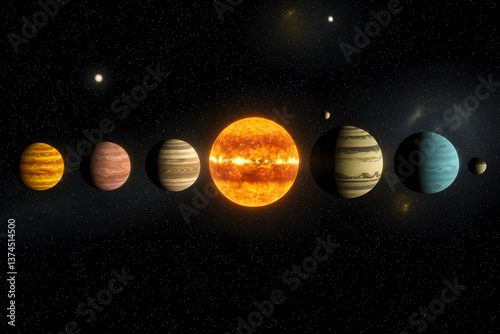 "Celestial Harmony: The Solar System's Dance with the Sun and Planets in a Starry Night Sky with a Dazzling Crescent Moon"