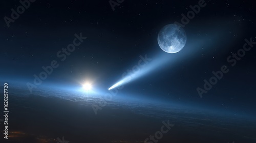 Celestial Scene Featuring Moon, Comet and Stars Over Earth Horizon