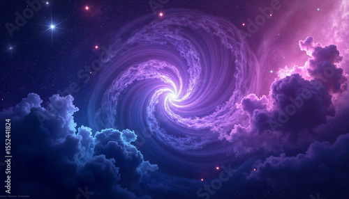 Celestial vortex swirls through the night sky with dreamy clouds and distant stars in a cosmic fantasy.