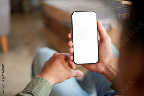 cell phone blank white screen mockup.hand holding texting using mobile on desk at office.background empty space for advertise.work people contact marketing business,technology