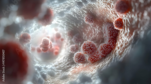 Cellular structure, close-up view of a biological pathway, showing reddish cells
