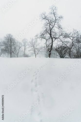 Central Park snow. Historic architecture in New York City Central Park. Beautiful bow bridge in Manhattan Central Park with snow flakes. Winter in NYC. Blizzard in New York City.