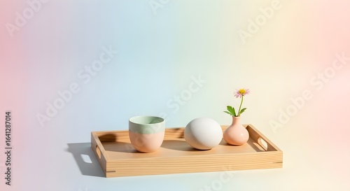 Ceramic objects and a single flower in a wooden tray against a pastel gradient background