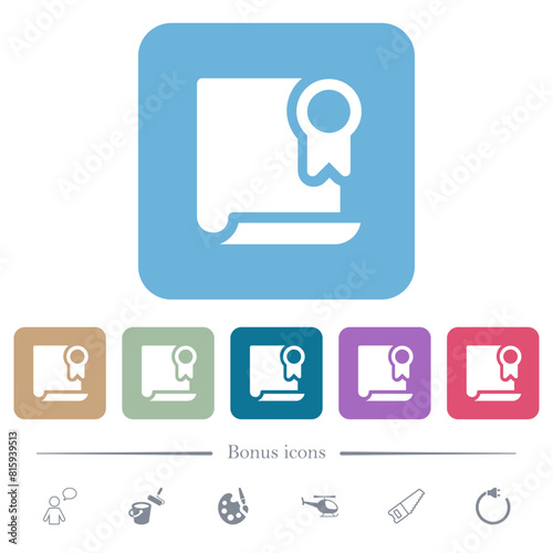 Certificate solid flat icons on color rounded square backgrounds
