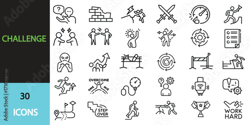 Challenge icon set. Containing mission, competition, obstacle, battle, problem solving, teamwork, overcoming. Editable stroke. Vector illustration transparent