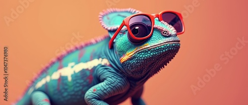 chameleon wearing sunglasses on a solid color background, vector art, digital art, faceted, minimal, abstract, panorama background.