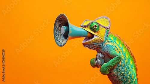 Chameleon with megaphone capturing attention in vivid orange setting image