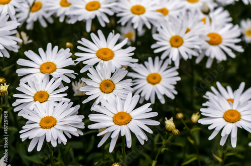 chamomile flowers with long white petals and a yellow center in the center on a clear summer day